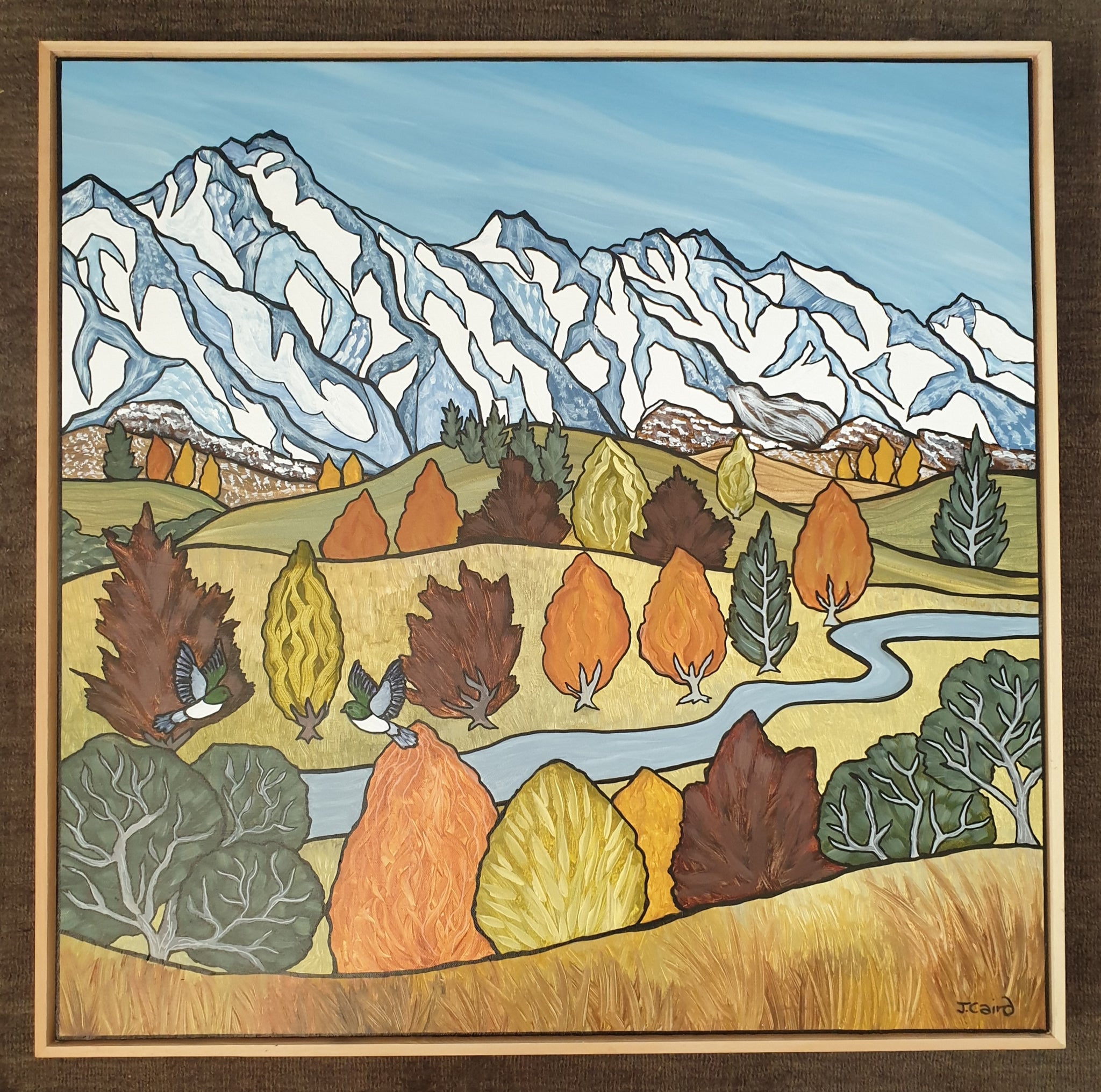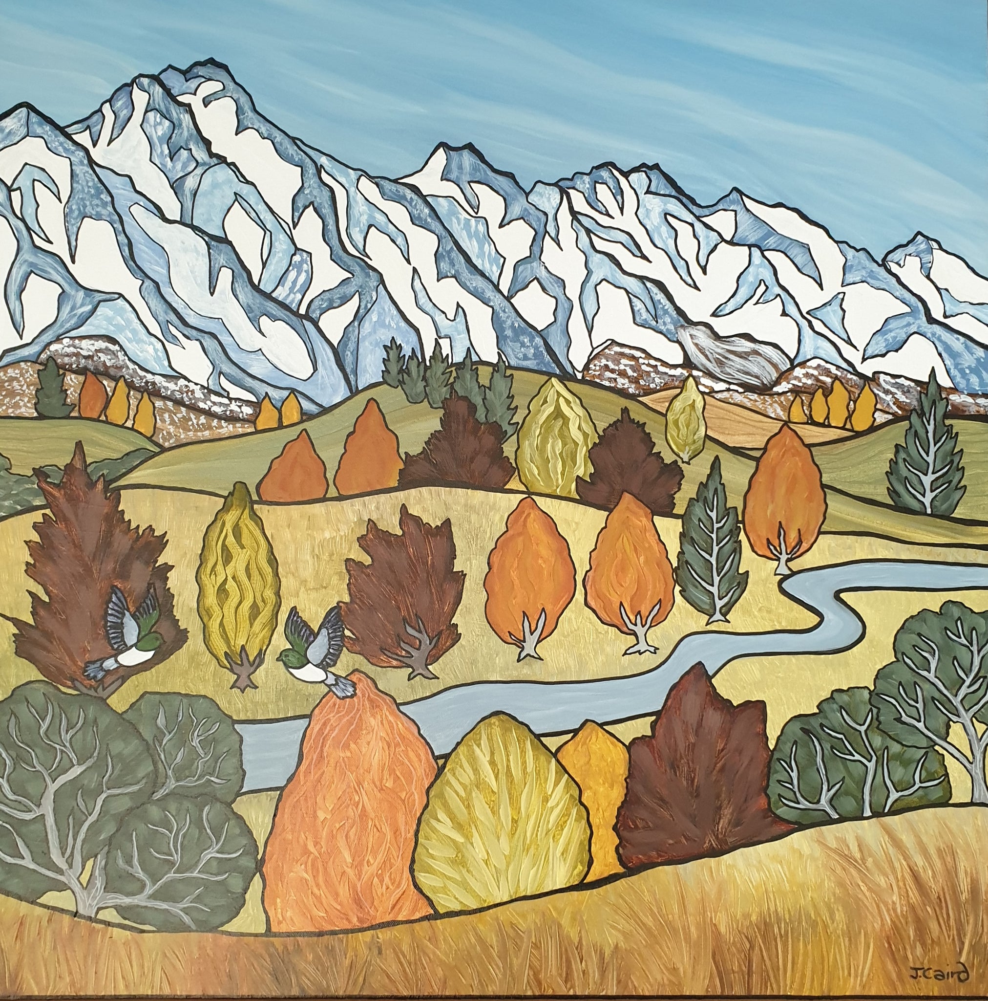Inspired by the vibrant landscapes of Queenstown, New Zealand, “Rivitalized” captures the gentle rhythm of the cycle way meandering beneath the majestic Remarkables mountain range. Bold lines and rich autumnal tones evoke movement and renewal, celebrating the harmony between human paths and the timeless grandeur of nature.