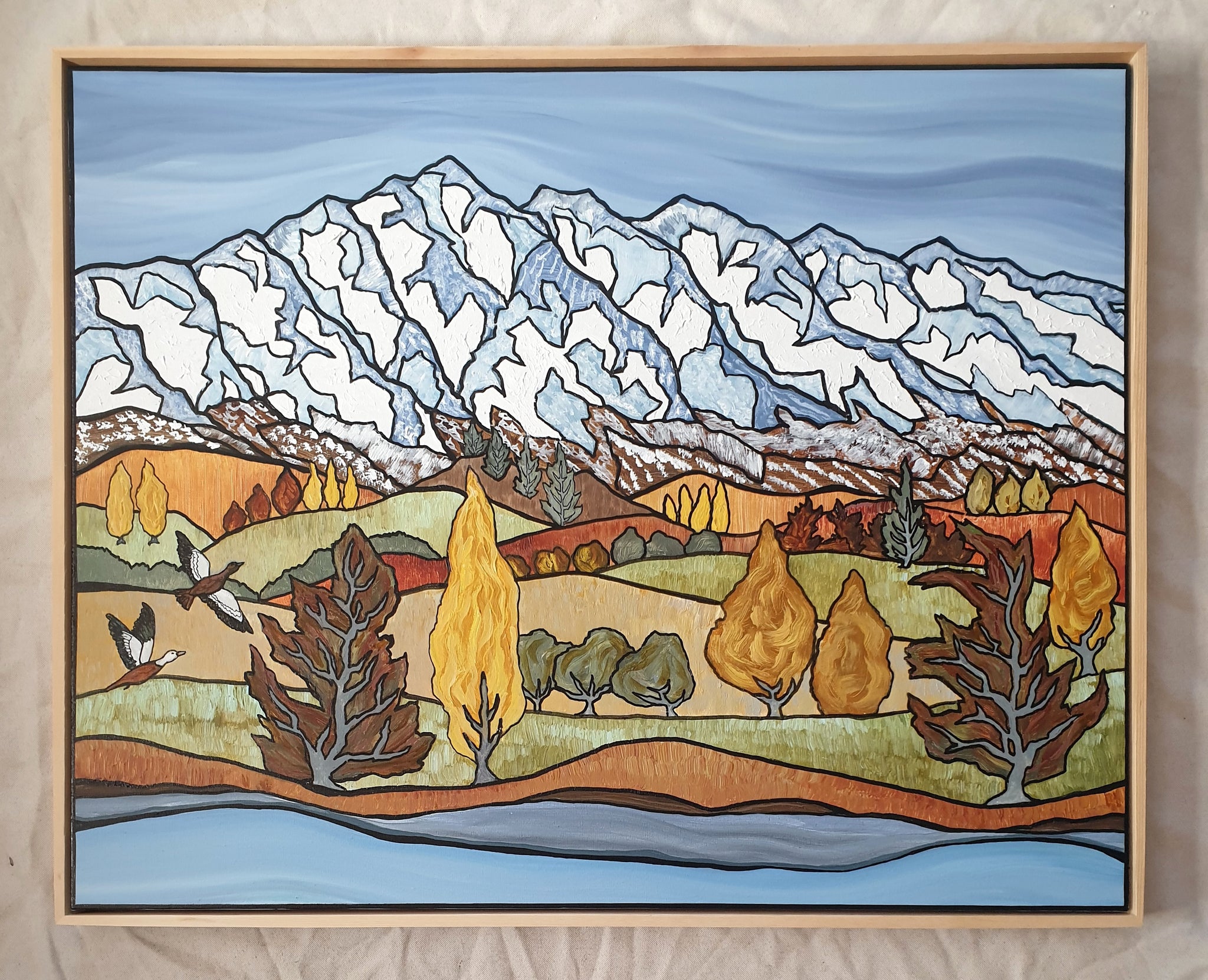Painting by Miranda J. Caird titled “Taking Flight”, featuring two Paradise Ducks flying over autumn fields by Lake Wakatipu, with the snow-covered Remarkables mountains in the background.