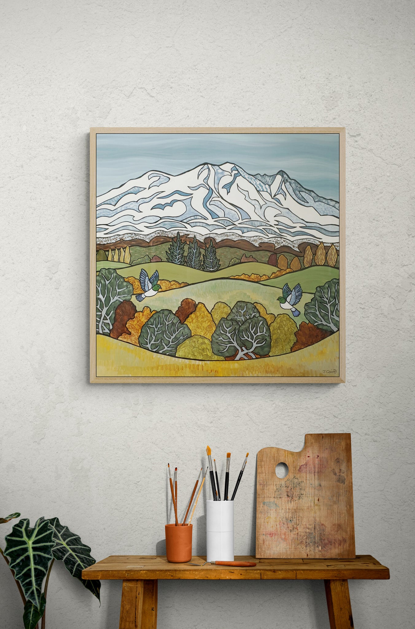 With bold contours, textured layers, and the earthy tones of autumn, this piece evokes both movement and stillness — a celebration of balance in nature’s design. The sweeping lines of the mountain mirror the gentle arc of flight, drawing the viewer into a landscape alive with rhythm and renewal.